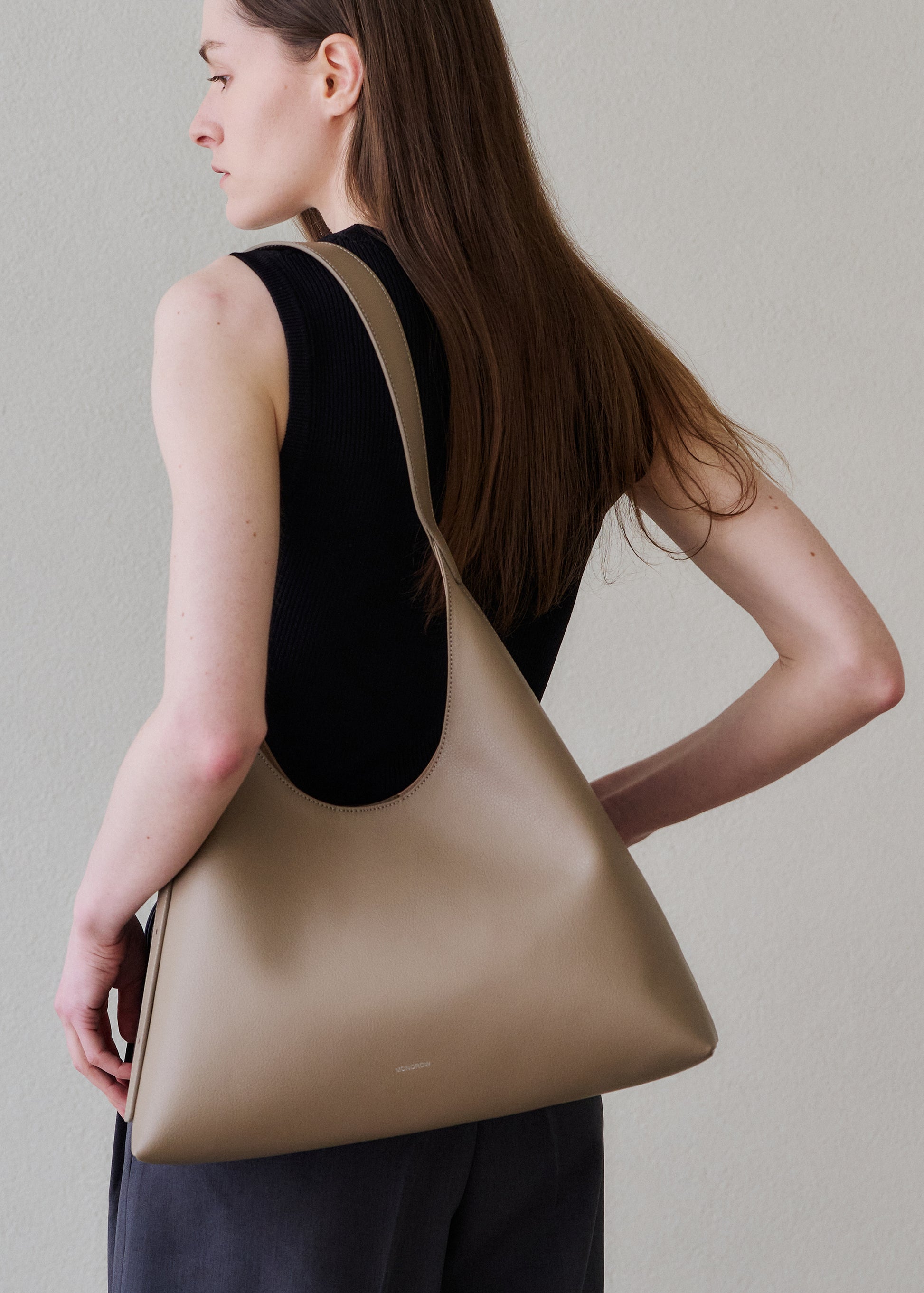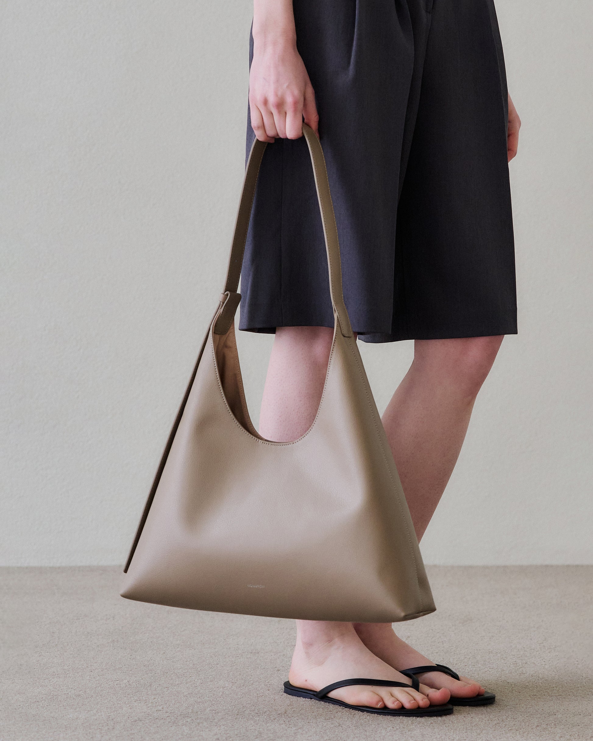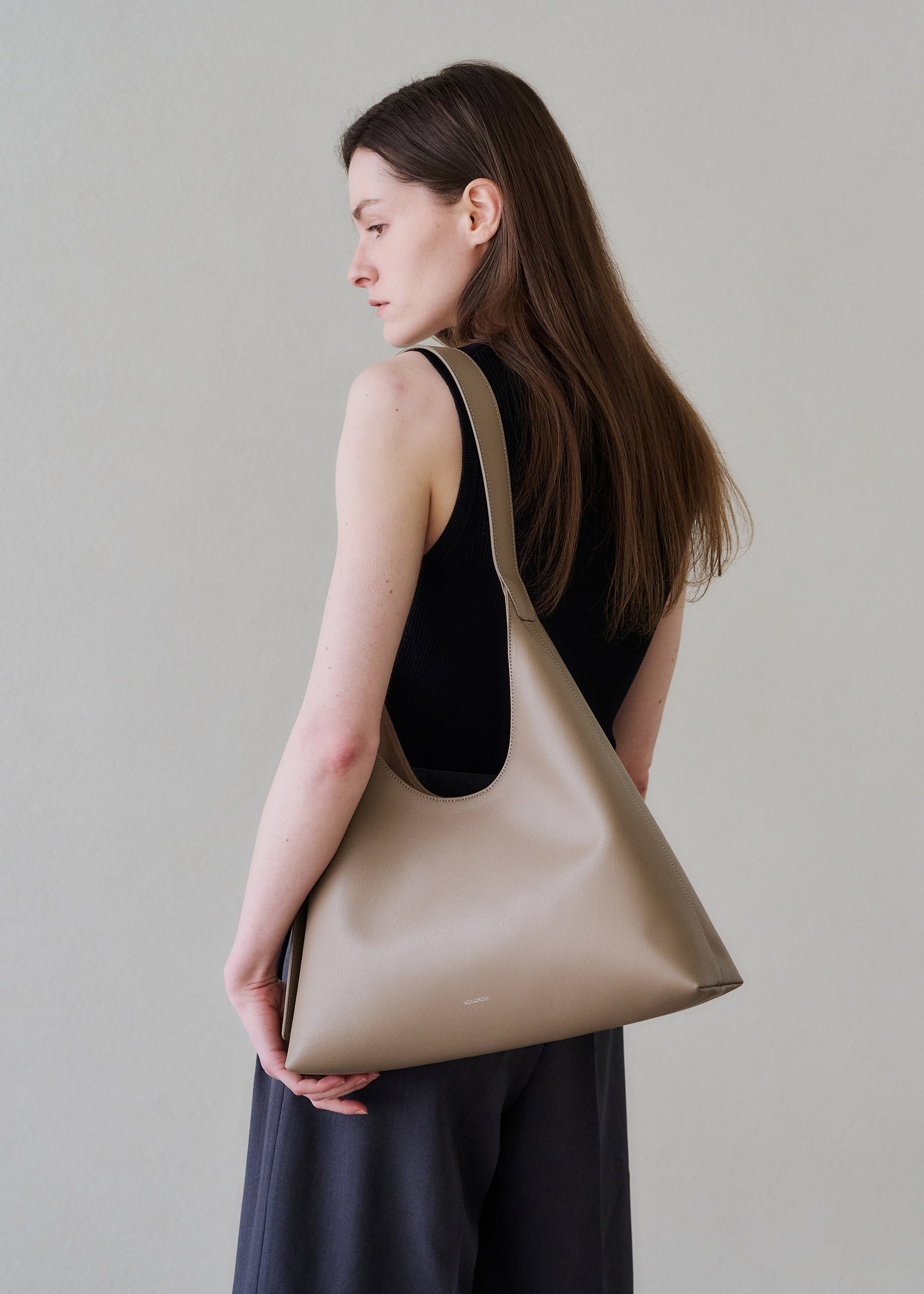 This shoulder bag has a simple yet chic design that combines straight and curved lines in a triangular silhouette.