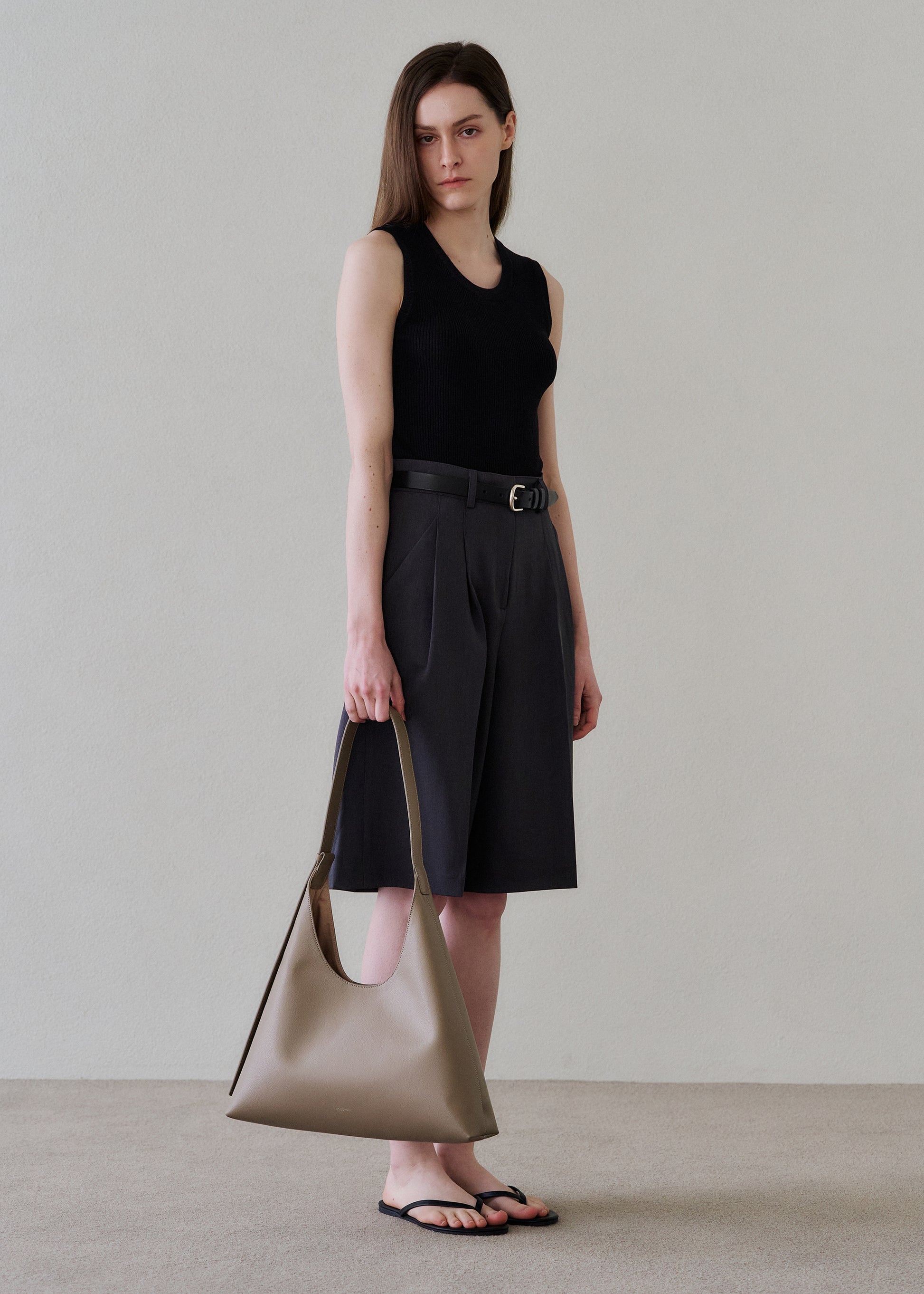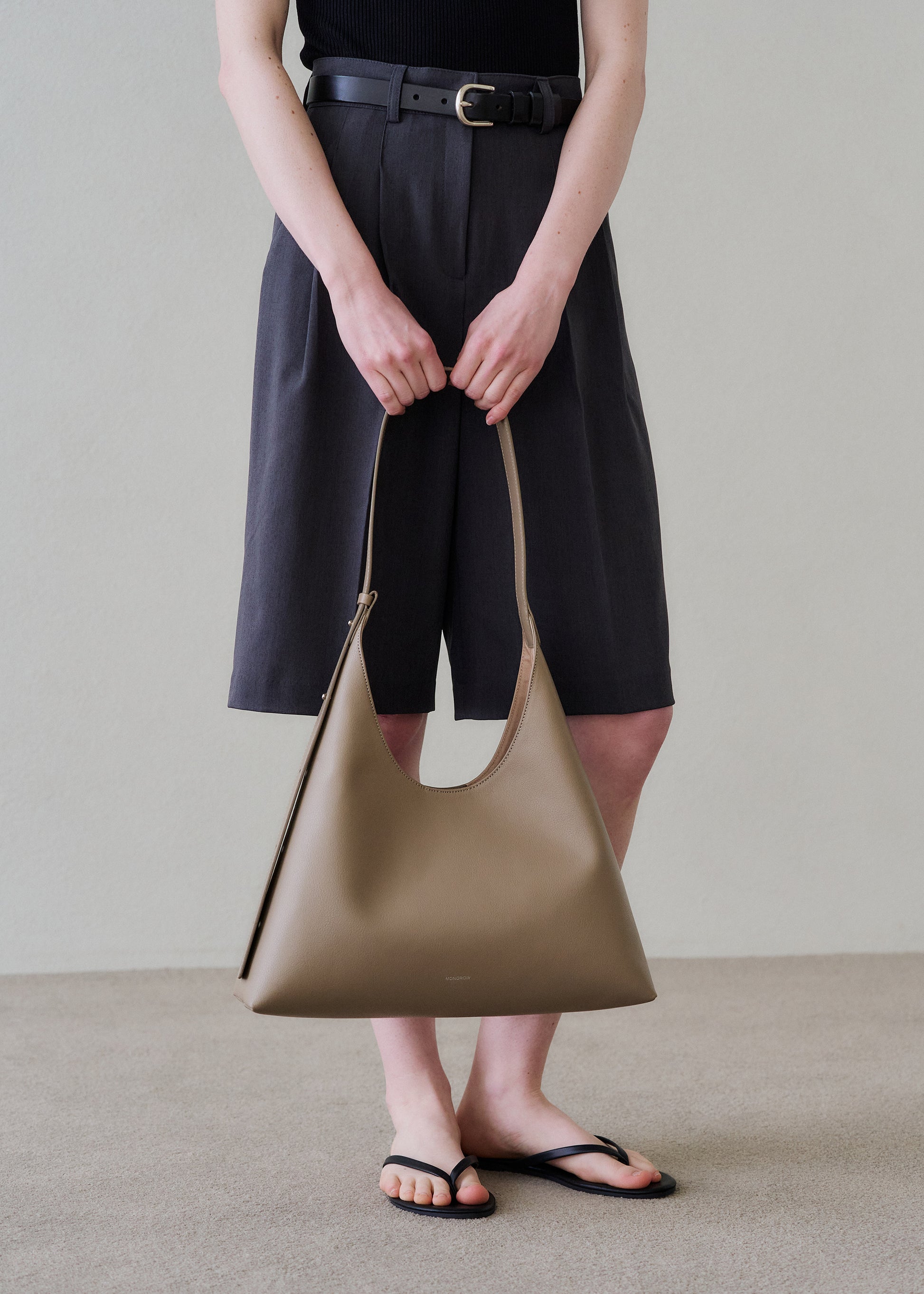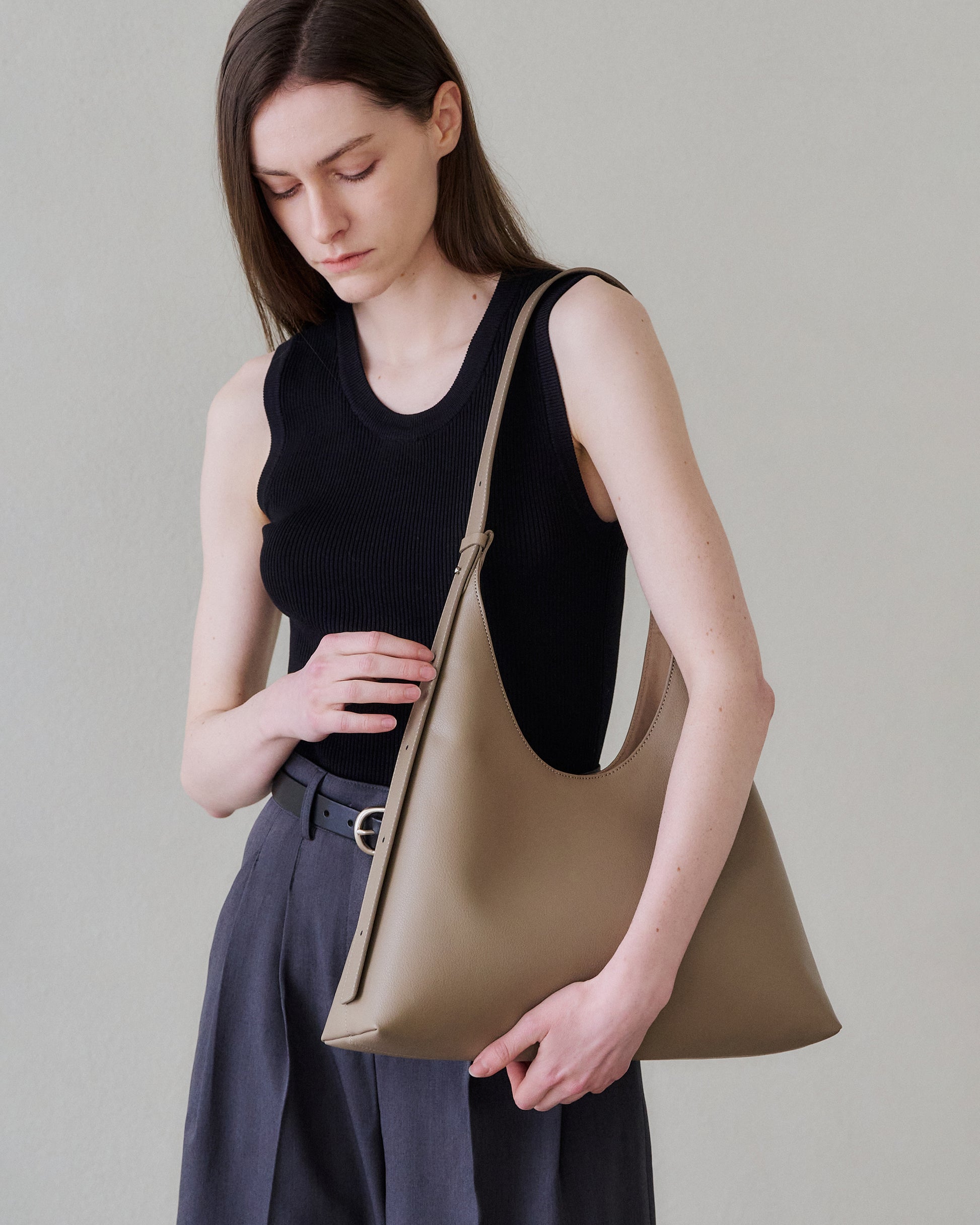 This shoulder bag has a simple yet chic design that combines straight and curved lines in a triangular silhouette.