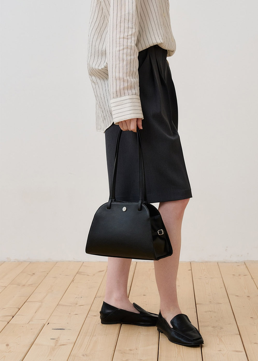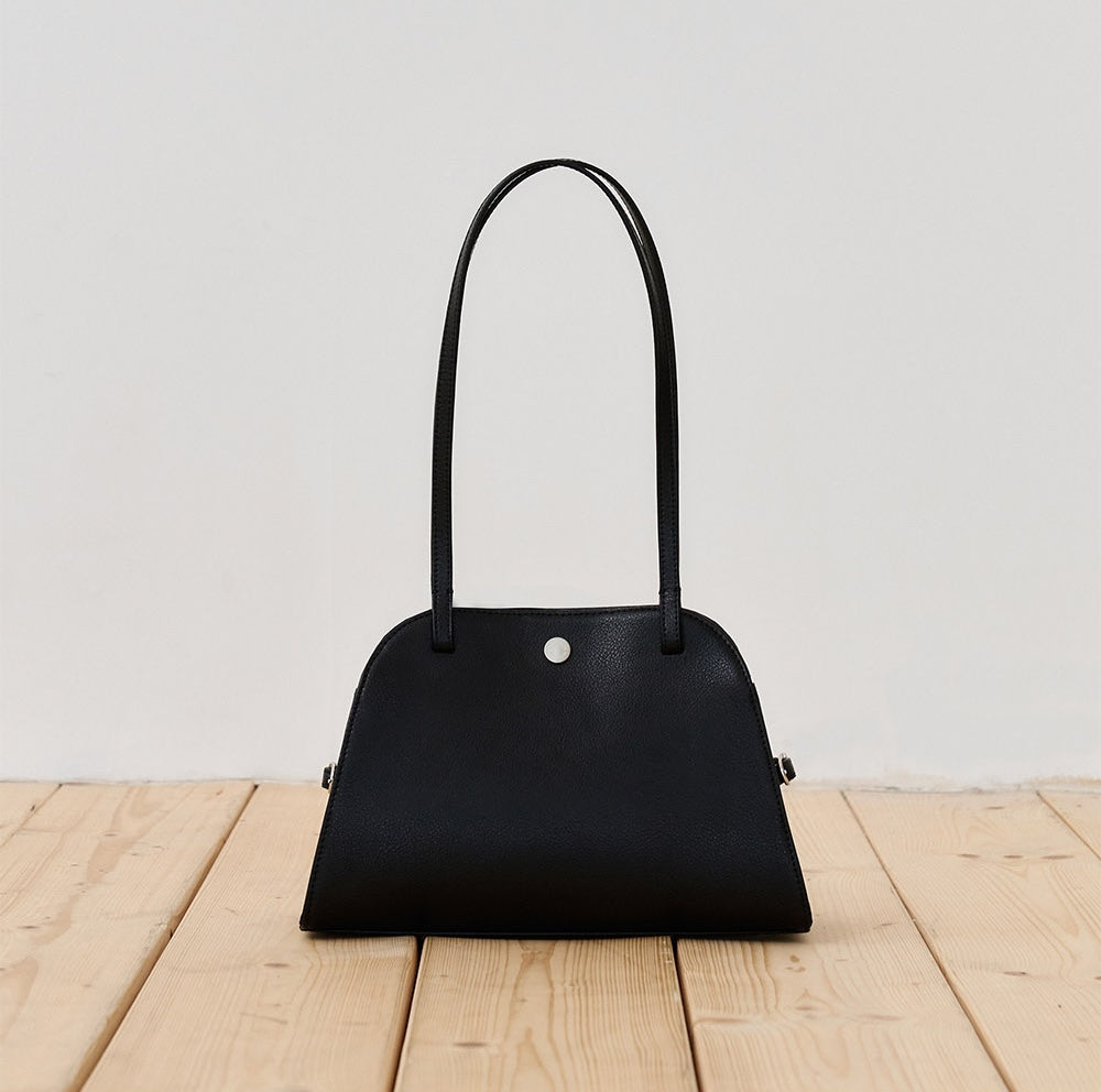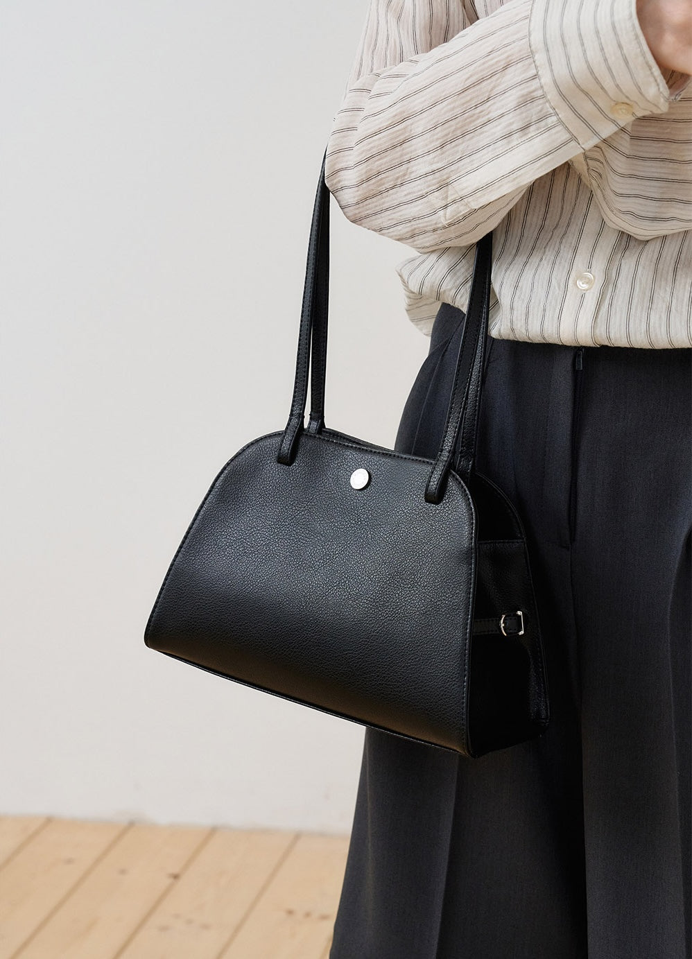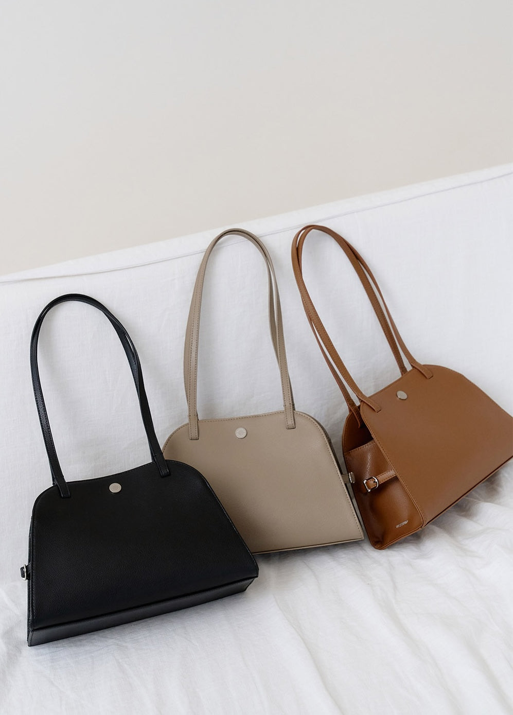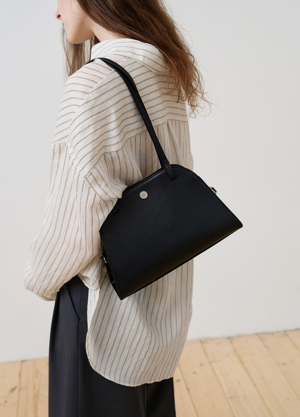 This is a sophisticated shoulder bag with a harmonious blend of soft curves and straight lines. Its basic design, combined with a comfortably long strap, enhances wearability, while minimal metal accents complete a sleek, polished look. The magnetic closure allows for easy and neat opening and closing, making it highly practical for everyday use.
