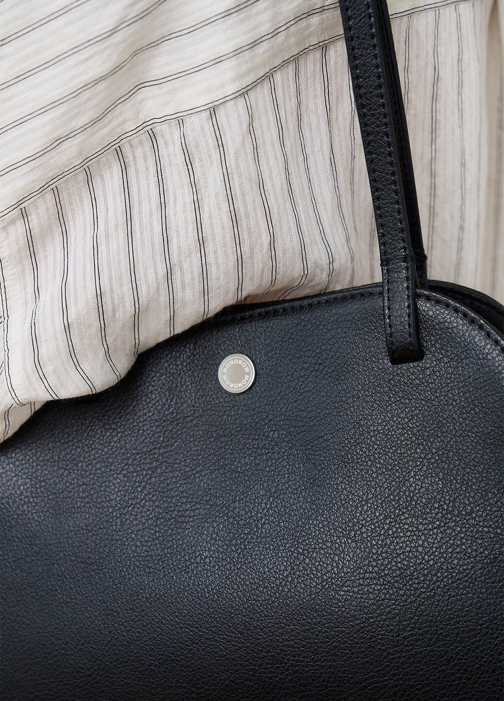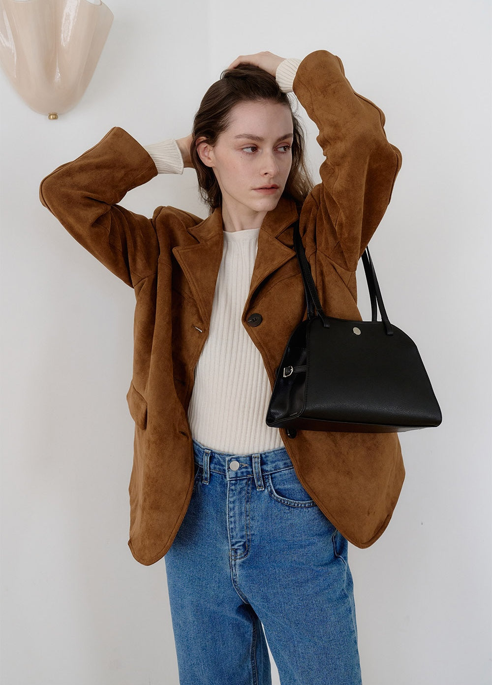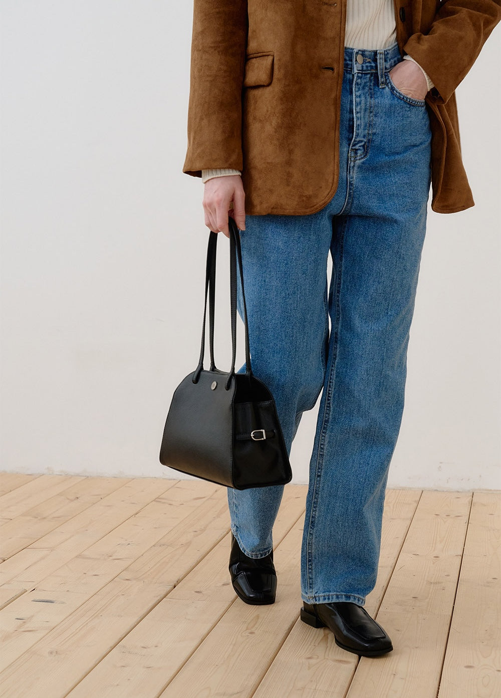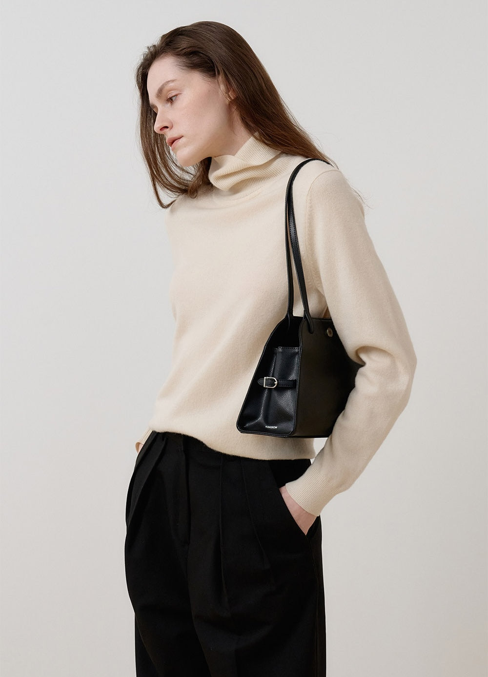 This is a sophisticated shoulder bag with a harmonious blend of soft curves and straight lines. Its basic design, combined with a comfortably long strap, enhances wearability, while minimal metal accents complete a sleek, polished look. The magnetic closure allows for easy and neat opening and closing, making it highly practical for everyday use.