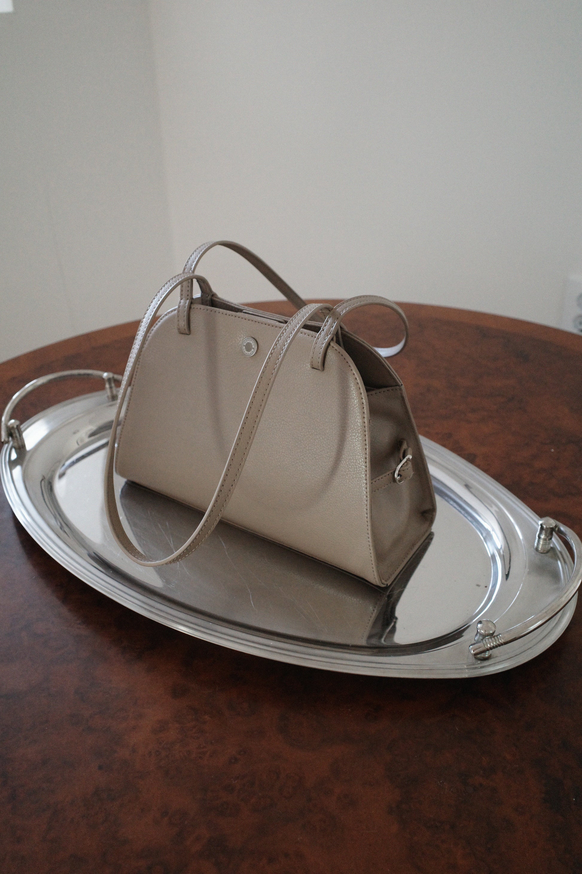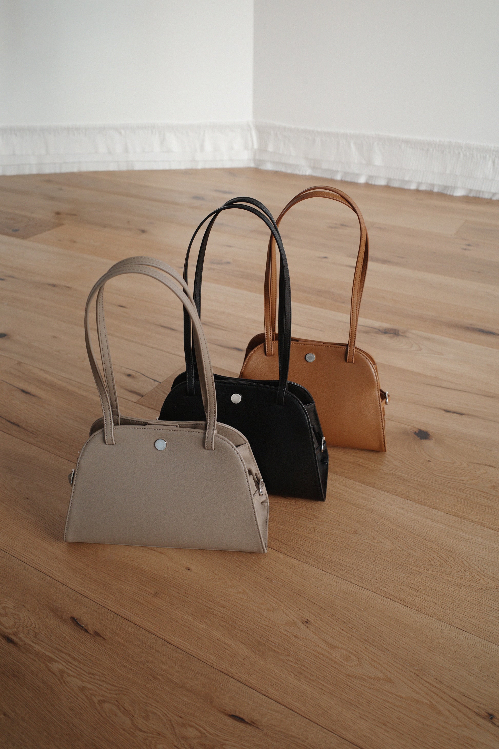 This is a sophisticated shoulder bag with a harmonious blend of soft curves and straight lines. Its basic design, combined with a comfortably long strap, enhances wearability, while minimal metal accents complete a sleek, polished look. The magnetic closure allows for easy and neat opening and closing, making it highly practical for everyday use.