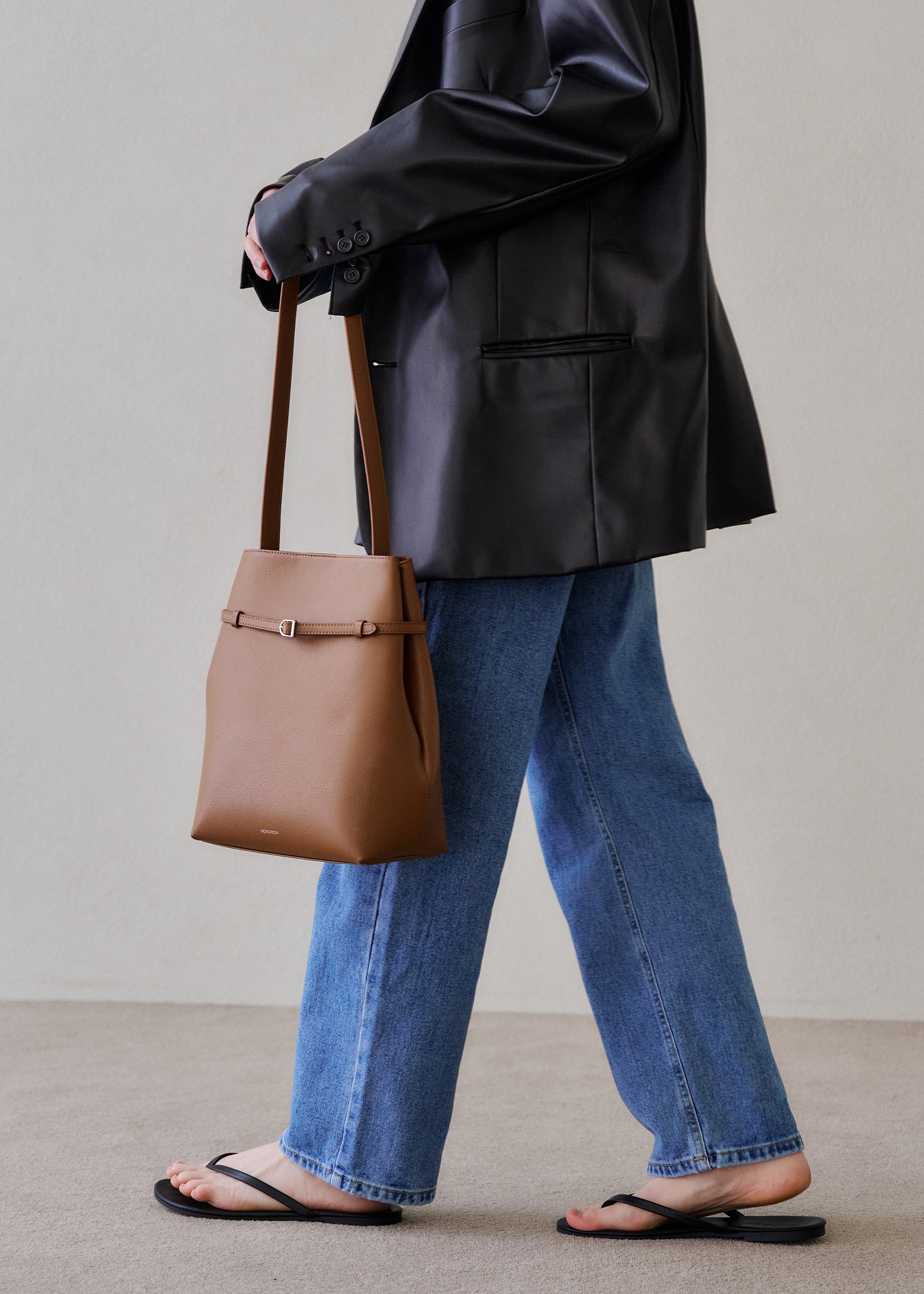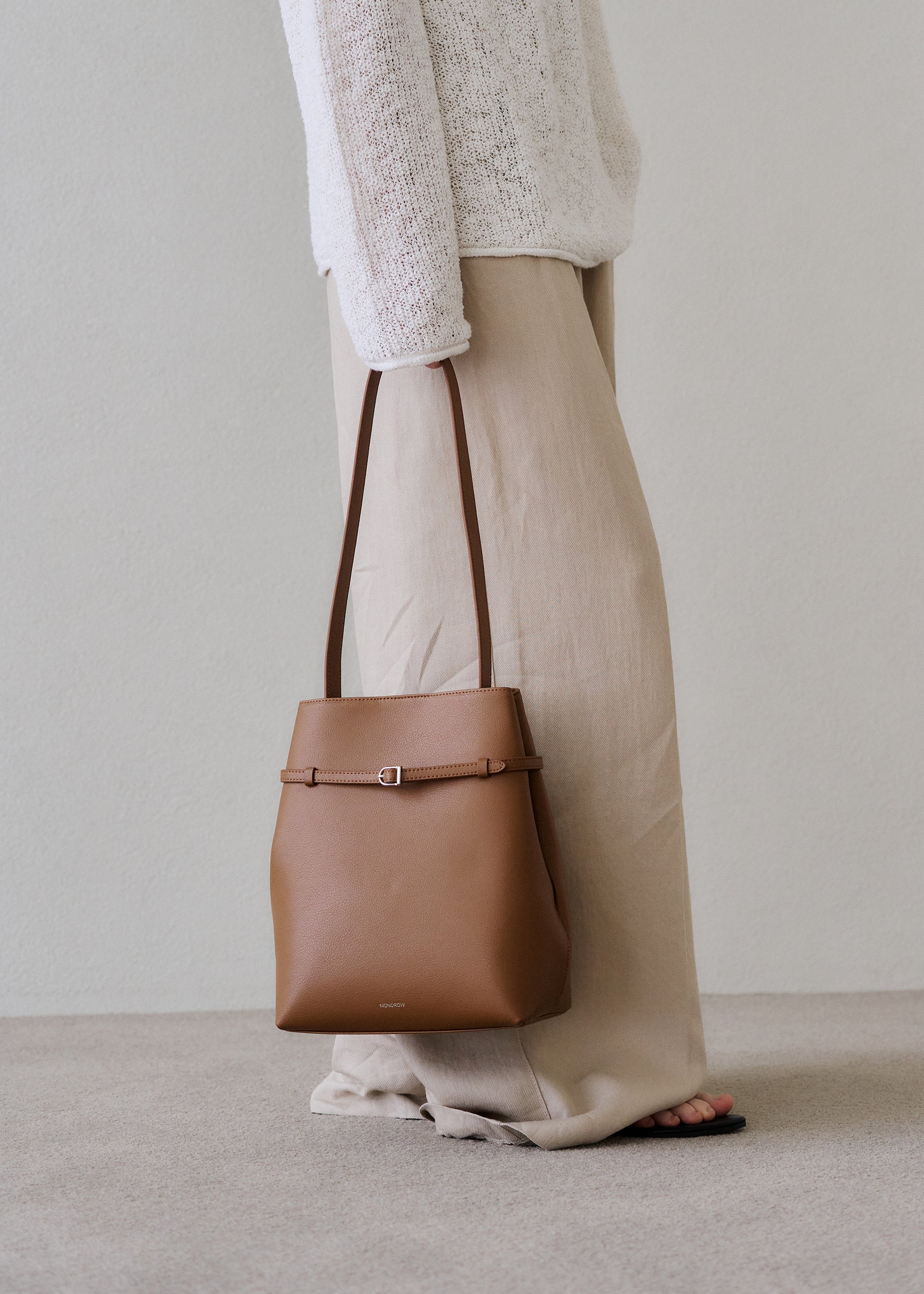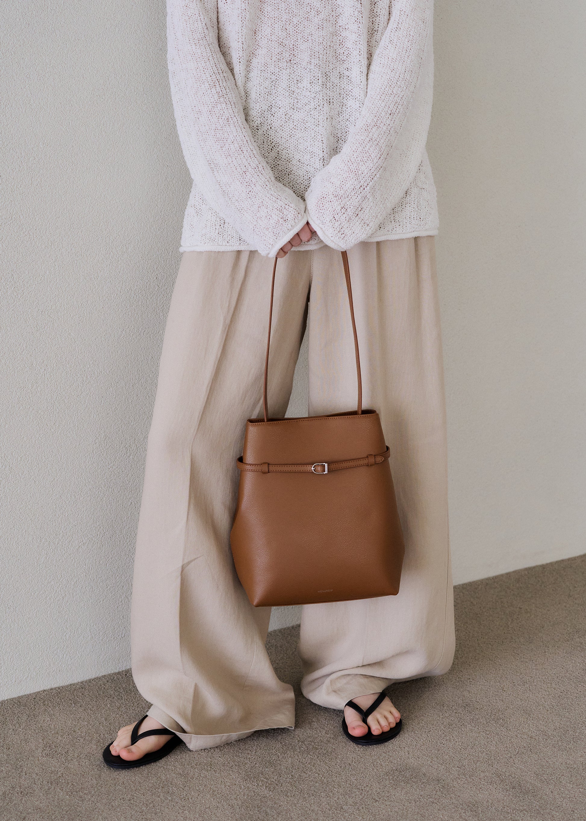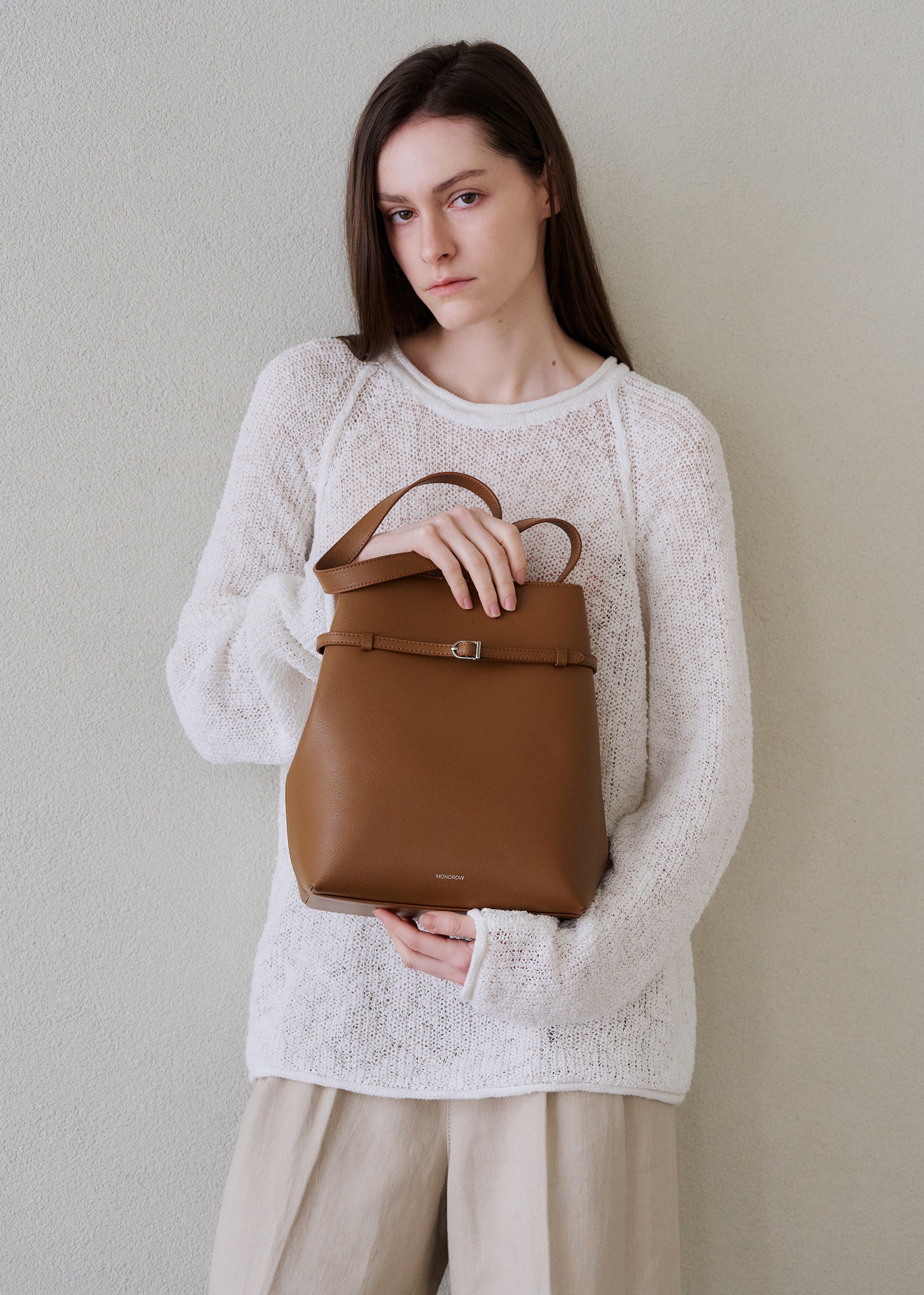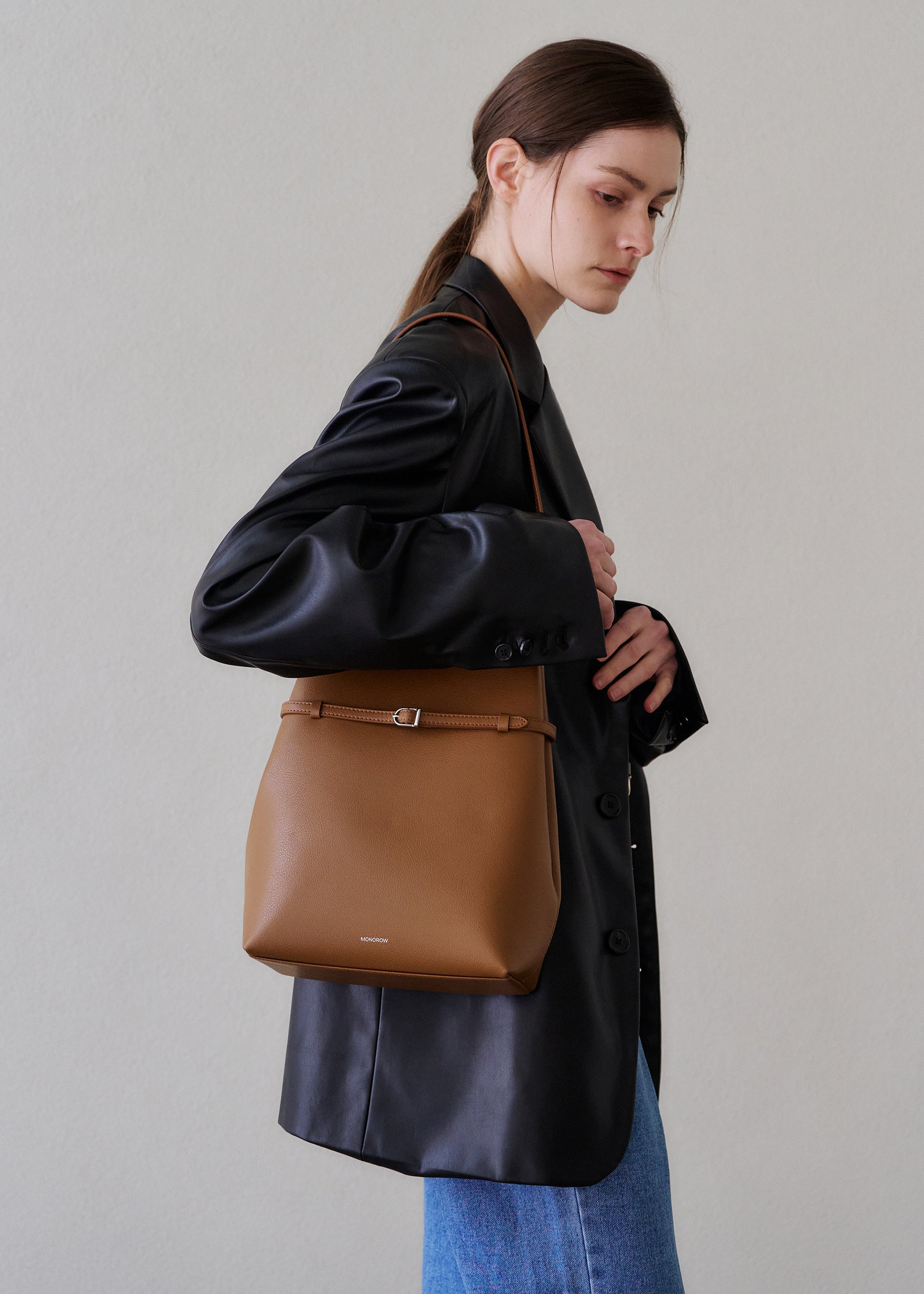 This is a formal design shoulder bag with Monorow's signature belt detail as a point.